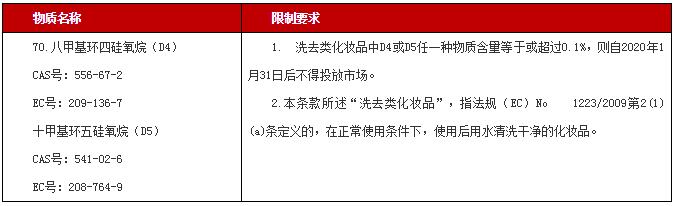 2018年1月10日,欧盟官方公报(OJ)发布指令 (EU) 2018/35,对欧盟REACH法规附件XVII进行修订,新增了对洗去类化妆品中八甲基环四硅氧烷(D4)和十甲基环戊四氧烷(D5)的限制,该法规将于2018年1月31日正式生效。