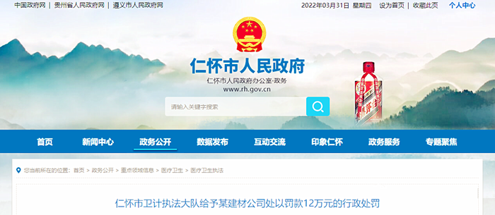 被仁怀市卫计执法大队处以警告、罚款人民币12万元的行政处罚,并责令改正相关违法行为。目前,该建材公司已自动履行罚款12万元整,并改正相关违法行为。